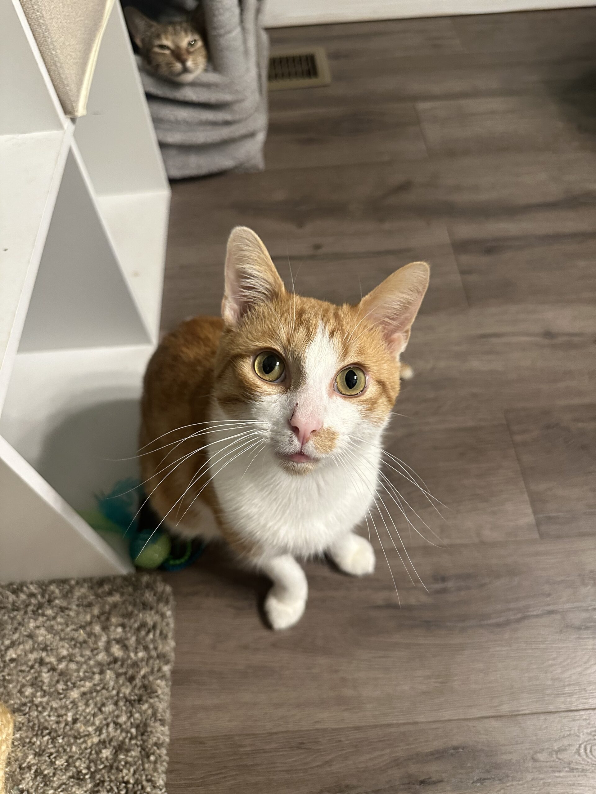 Moccasins is our Cat of the Month! Moccasins is a 1 year old male who has been in our lounge since 9/25/25. This guy is extremely outgoing and playful. He has that classic crazy orange cat energy. Moccasins is eager to find someone amazing!