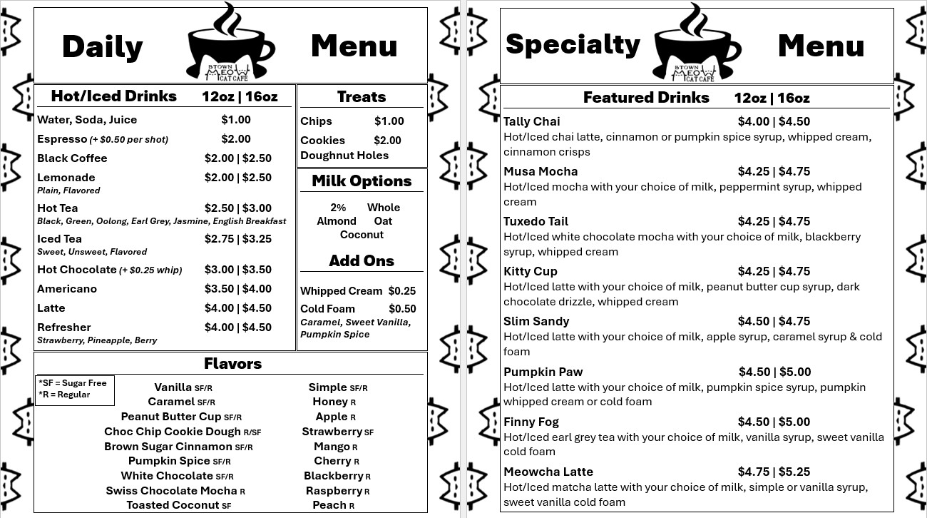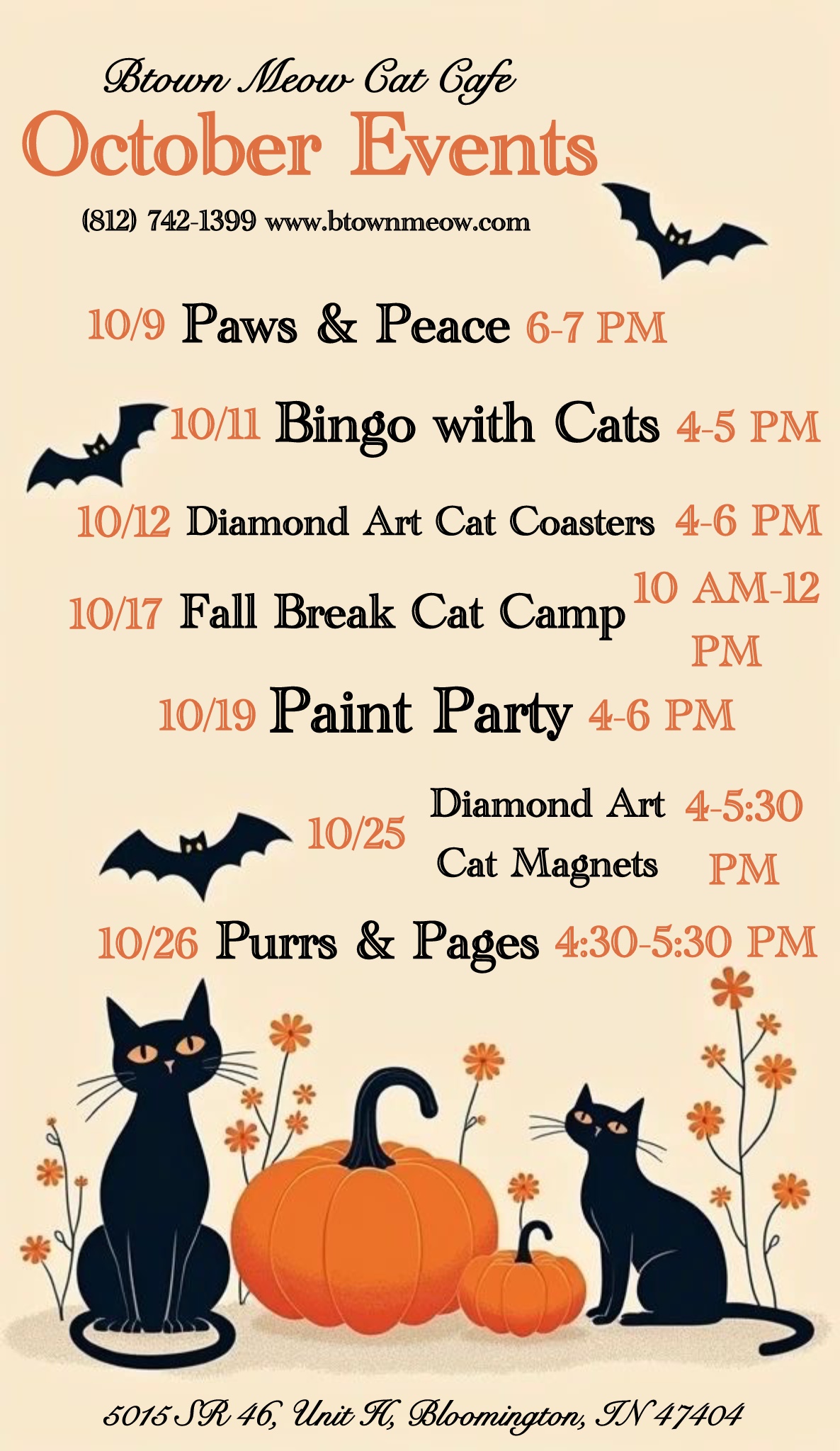 We offer a variety of select beverages and prepackaged treats that you can enjoy in the café or while spending quality time with our adoptable cats. All of our cats come with unique personalities and will be roaming freely in the cat lounge.