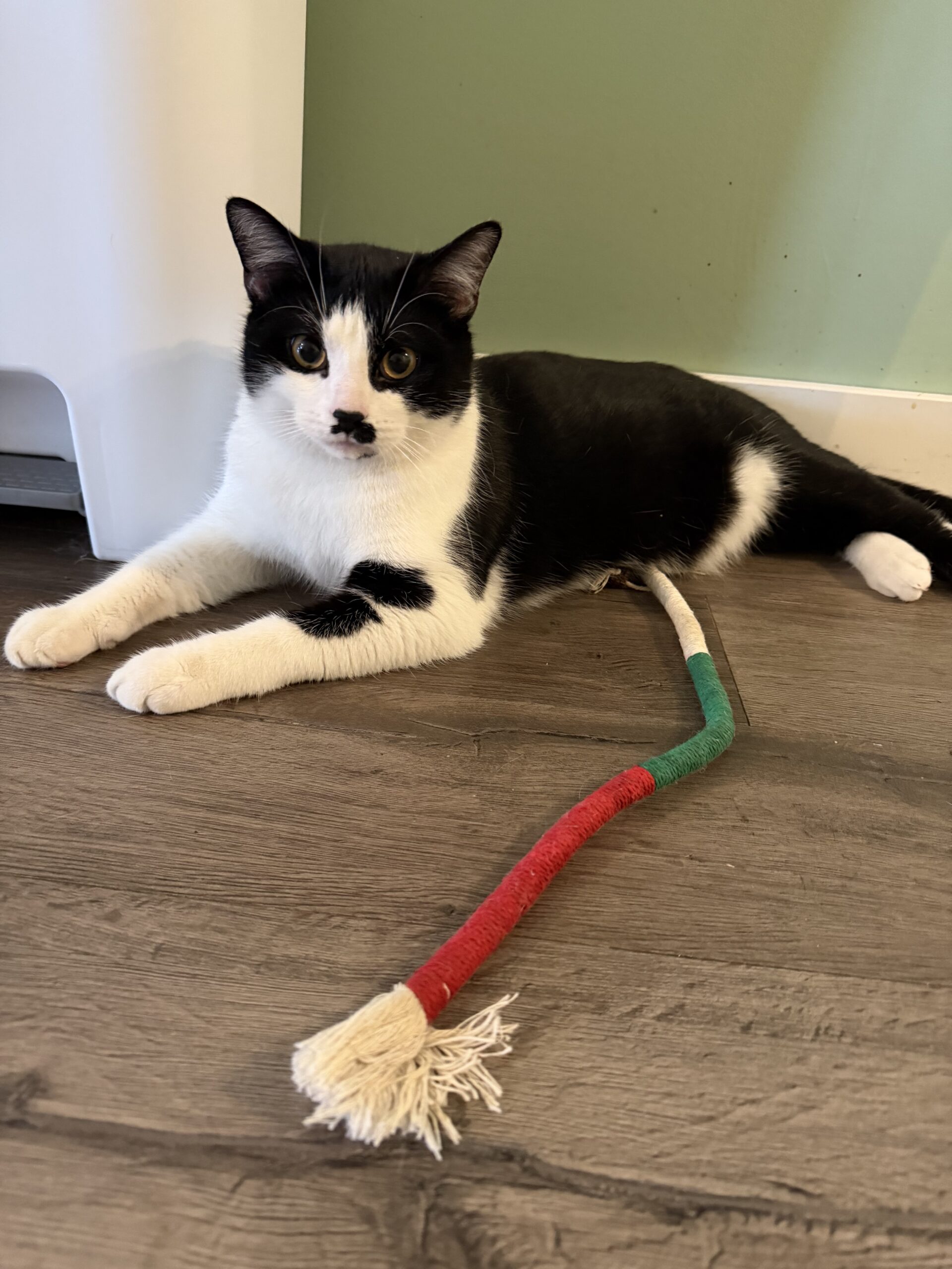 Mister Mustachio is a 1 year old male who has been in our lounge since 1/6/25. He has tons of energy and loves toys. Mister Mustachio is excited to meet his partner in crime!