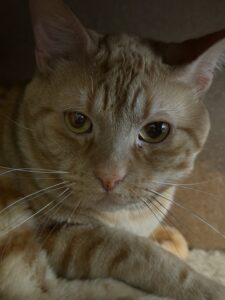 Moccasins is a 1 year old male who has been in our lounge since 11/2/25. This guy is extremely outgoing and playful. He has that classic crazy orange cat energy. Moccasins is eager to find someone amazing!