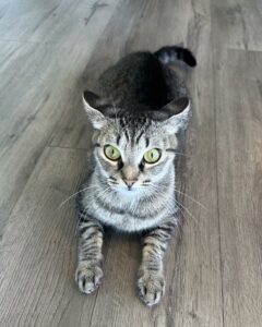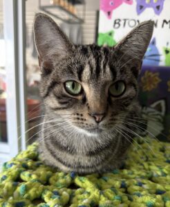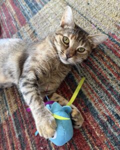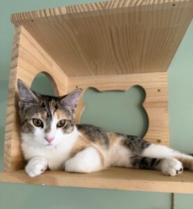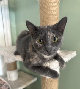 Manon is a 1 year old female who has been in our lounge since 9/26/25. She is a tiny girl with a mighty voice. Playing and sleeping are her main priorites. She can be quite sassy to humans but we know she secretly loves the attention. Manon is excited to meet her partner(s) in crime!