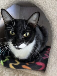 Mary Kate is a 4 year old female who has been in our lounge since 9/25/25. She is a reserved but curious gal. You will probably find her on a cat bed curled up, looking cute. Mary Kate is patiently waiting for furever!
