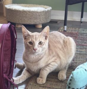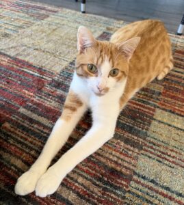 Moccasins is a 1 year old male who has been in our lounge since 9/25/25. This guy is extremely outgoing and playful. He has that classic crazy orange cat energy. Moccasins is eager to find someone amazing!