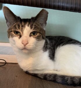 Moccasins is a 1 year old male who has been in our lounge since 11/2/25. This guy is the perfect mix of chill and playful. He gets along well with other cats. Moccasins is eager to find someone amazing!