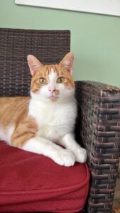 Moccasins is a 1 year old male who has been in our lounge since 11/2/25. This guy is extremely outgoing and playful. He has that classic crazy orange cat energy. Moccasins is eager to find someone amazing!